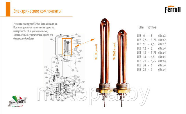 "Ferroli" – итальянская компания, основанная в 1955 году в Вероне братьями Ферроли. Специализируется на производстве отопительного оборудования, включая газовые, электрические котлы и водонагреватели. Ferroli известен сочетанием итальянского дизайна с практичностью, предлагая энергоэффективные решения для дома. Производственные мощности расположены в Италии, Китае и других странах, что позволяет адаптировать продукцию к разным рынкам. Бренд сертифицирован по стандартам ISO 9001 и активно развивает экологичные технологии, такие как высокоэффективные электрические котлы серии LEB.