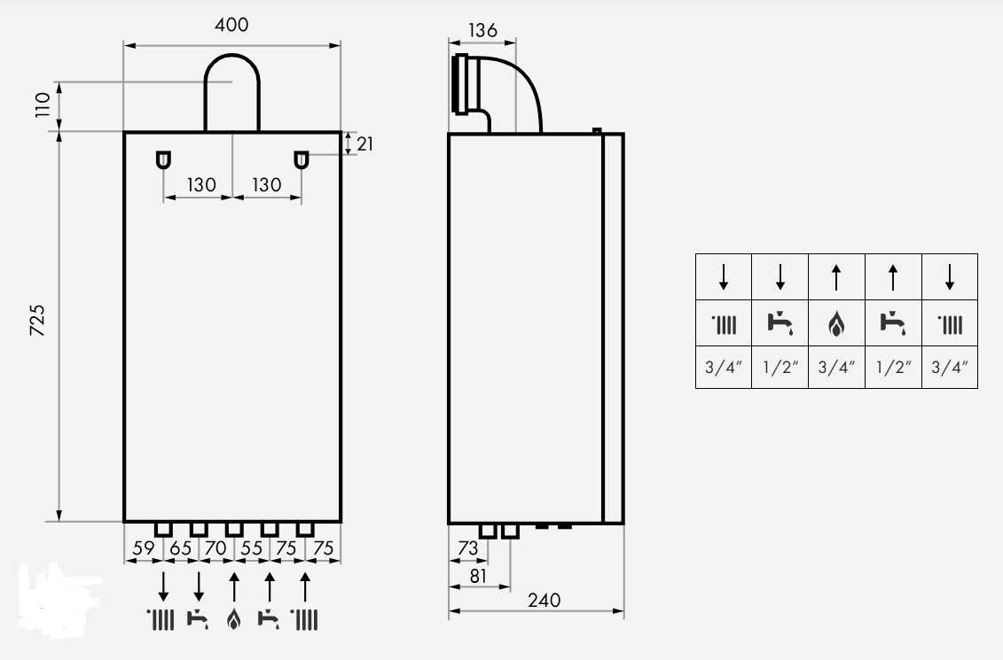 Прибор является двухконтурным и помимо отопления имеет функцию нагрева горячей воды, для производства которой используется вторичный теплообменник из нержавеющей стали с увеличенным количеством пластин. Котел дополнительно снабжен датчиками температуры холодной и горячей воды, а также специальным датчиком расходомером, что позволяет в форсированном режиме мгновенно нагреть и поддерживать на комфортном уровне температуру воды.