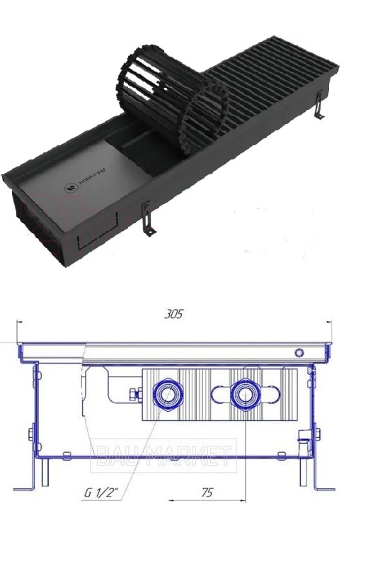 - Внутрипольный конвектор работает с любым видом отопительного котла с температурой до 100°С. Подключение конвектора к системе отопления возможно с помощью двух соединителей с внутренней резьбой G1/2” и трубы любого типа.