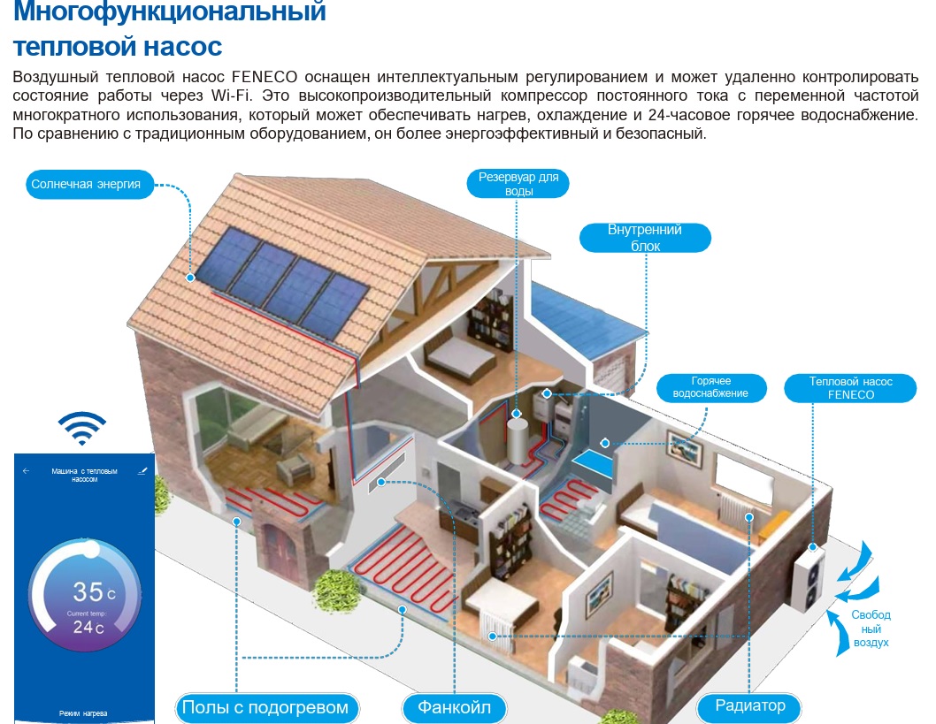 Тепловые насосы «воздух-вода» уникальны тем, что могут работать даже при отрицательных температурах. Это значит, что их можно использовать круглый год, обеспечивая не только тепло зимой, но и охлаждение в теплые месяцы.