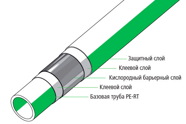 Изделие состоит из пяти слоев, внутренняя защита препятствует проникновению кислорода. ПЭ труба отличается стабильностью при колебании температуры и давления, имеет незначительное линейное удлинение, устойчивая к механическим воздействиям. Относится к эксплуатационному классу 5, 6 бар. Максимальная температура эксплуатации не должна превышать 90 градусов Цельсия.